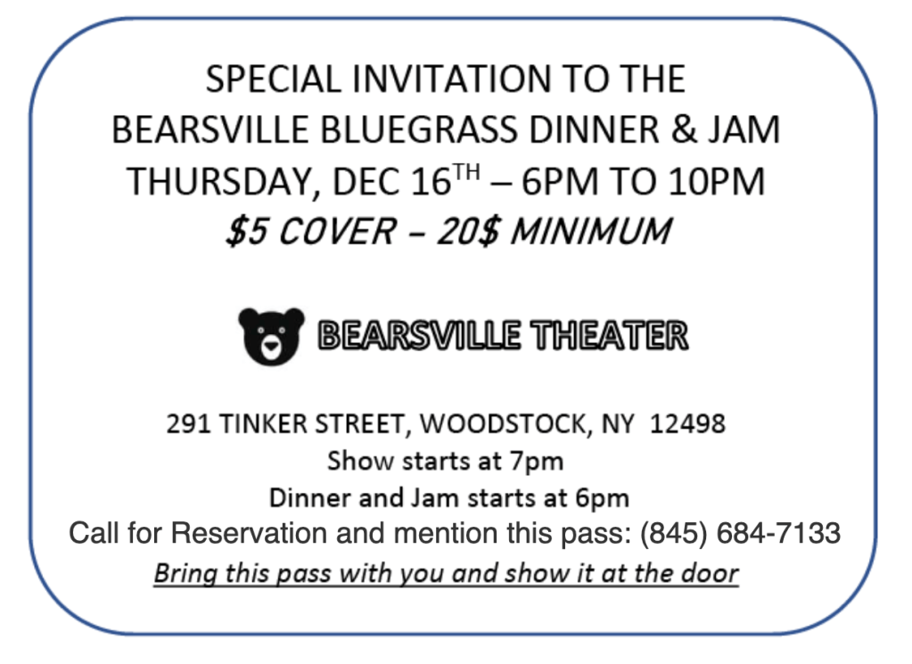 We hope that December 16th will be the first in a series of Bearsville Bluegrass Nights that may grow to include workshops and breakout groups – something like a mini, one night festival atmosphere and a place for bluegrass enthusiasts to connect and have a good time.