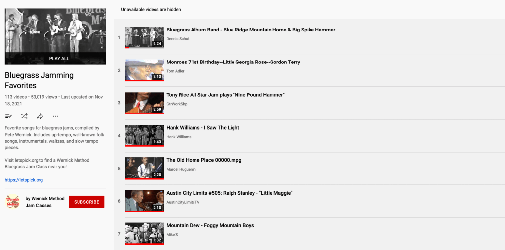 Pete Wernick, Banjo player of Hot Rize, is a fierce advocate for getting people together to jam. He put together a free playlist of OVER 100 tunes that he believes are great for Bluegrass Jamming.
