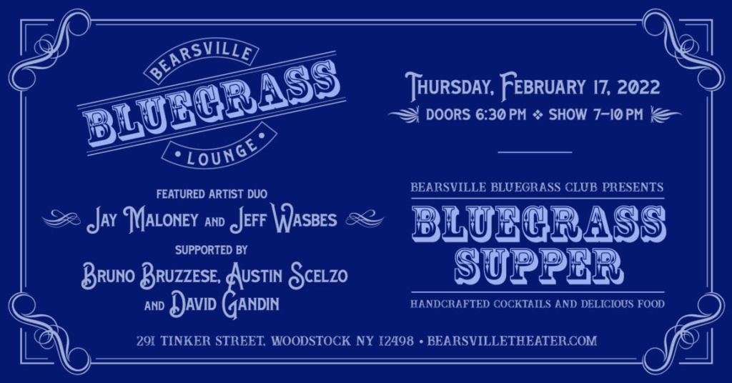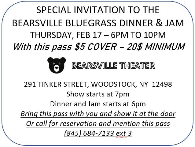 After 6pm, cover and minimum will apply. Our first Bearsville Bluegrass Night was a great success. We hope these monthly events will grow to include workshops and breakout groups – something like a mini, one night festival atmosphere and a place for bluegrass enthusiasts to connect and have a good time. Tickets purchased online for this event include dinner and the show, and cost $35 to $45. However if you are a picker or a fan of the performers, you can pay just a $5 cover and $20 minimum, by using this “Bluegrass Incentive Pass” (Please print or show on your phone at the door).If you’d like to reserve a table and plan to use your incentive pass you can call ahead at 845.684.7133, Ext 3.For more info about Jay Maloney, Jeff Wasbes and Austin Scelzo; or what’s on the menu for the Bluegrass Supper, check the Bearsville Theater Events Page