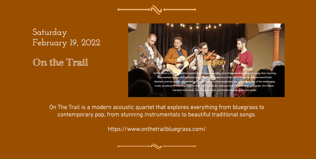 Saturday, Feb 19: Just 15 mins from the CT border, this show will be preceded by an all day Wernick Method Bluegrass Jam class from 10-6