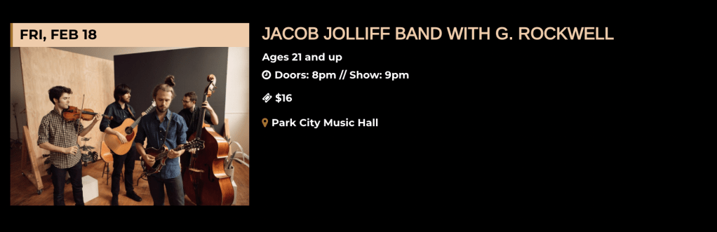 Friday, Feb 18 – The infamous Jacob Jolliff will bring an incredible cast of bluegrass players to Bridgeport at the newly renovated Park City Music Hall. G Rockwell, a Connecticut native who grew up in Bridgeport is now studying contemporary improvisation on THE BANJO at the New England Music Conservatory will open for Jacob.