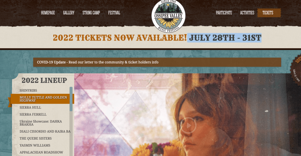 “Our festival features bluegrass, roots, americana, jazz, soul, and folk musicians of world renown. Many of them have won or have been nominated for Grammy, Juno, and IBMA awards. We also feature artists of folk traditions from around the world whose traditions have inspired American Roots Music or are now a part of American melting pot culture, and we always try to feature music in other languages. Our festival is also an all-inclusive experience–a ticket includes access to workshops, dances, yoga, kids music programs & activities, camping and more. The festival also offers local farm food & craft beer, and art and specialty goods handcrafted by our vendors. While the festival has been canceled for 2020 and 2021 due to Covid 19, we are excited to return in 2022!