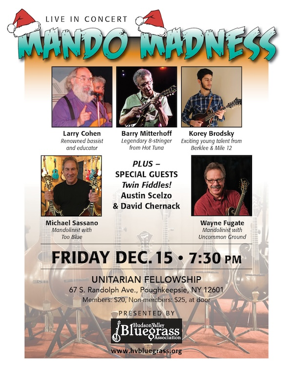 After a four-year hiatus, Mando Madness is back at the HVBA! Veteran Hudson Valley-based picker and Too Blue mandolinist Mike Sassano again assembles a crack team of eight-string aficionados for a night of mandolin mania. This year’s show will feature Wayne Fugate, Barry Mitterhoff, Korey Brodsky, Larry Cohen, and special guests. Don’t miss this show!Friday –