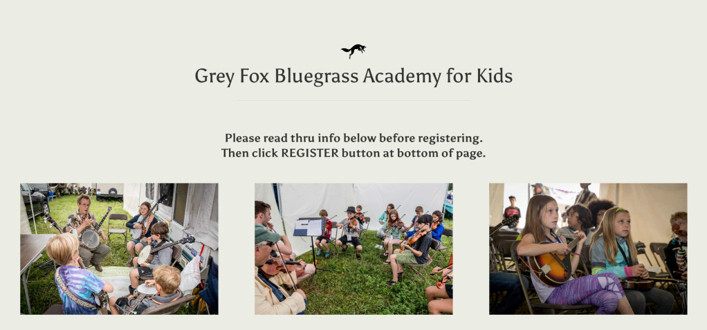 Check out the Bluegrass Academy for Kids 2020 and 2022 videos. 2020 video was a special performance for the virtual Spirit of Grey Fox, created by Mark Panfil.