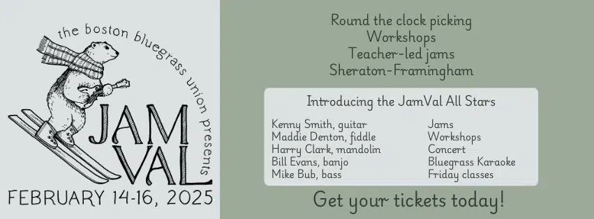 JamVal 2025 will be a weekend-long bluegrass “non-festival” focused on jamming held over President’s Day Weekend (February 14 – 16, 2025). There will be dozens of workshops and jams hosted by loads of amazing musicians and teachers, and one big difference from usual festivals: no big stage show to distract from the picking! For those who missed the original JamVal, last year’s schedule is available HERE.