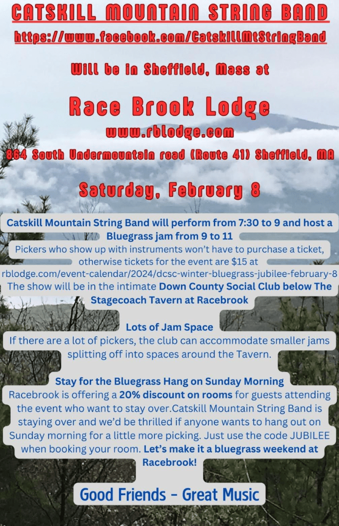 Racebrook is offering a 20% discount on rooms for guests attending the event who want to stay over. Catskill Mountain String Band is staying over and we’d be thrilled if anyone wants to hang out on Sunday morning for a little more picking. Just use the code JUBILEE when booking your room. Let’s make it a bluegrass weekend at Racebrook!
