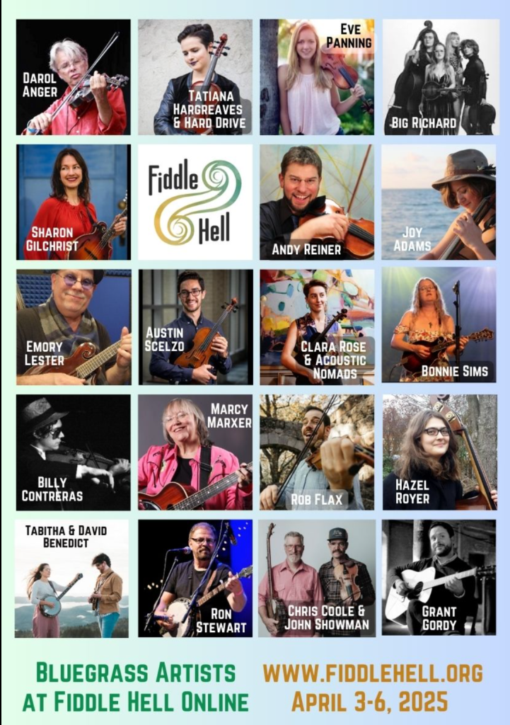 If you join us at Fiddle Hell Online, April 3-6, you’ll learn great bluegrass tunes, traditional playing styles, invaluable techniques, and interesting history – and widen your smile! Many more styles, too. Enjoy 193 live workshops, 27 jams, and 30 concerts – and 3 months of free replays – with 100 world-class artists. Seniors & young musicians get discounts at https://fiddlehell.org