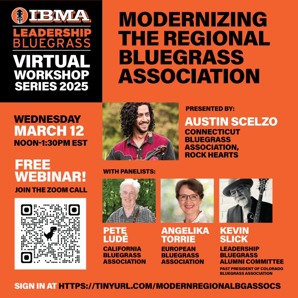 “Explore best practices for a successful and impactful 21st century bluegrass association including activities, membership benefits, festival/jam maps, funding and outreach, and useful website resources/links. Keep in touch throughout the year by joining a global forum at CTbluegrass.com/forum. “