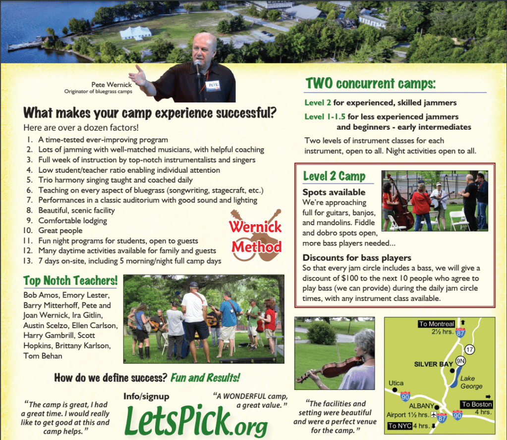 Directed by Pete Wernick (Dr. Banjo) of Hot Rize and Austin Scelzo (Rock Hearts, On the Trail) and held at Silver Bay, NY at the Silver Bay YMCA Conference Center.