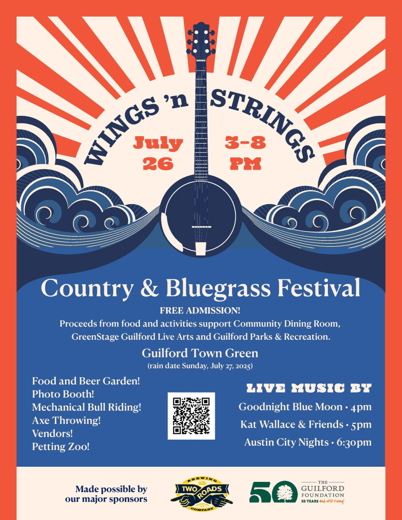 July 26th, Guilford Town Green. Features bluegrass and country music, BBQ, and other food vendors Click Here for more info