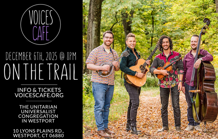 On Saturday, December 6th at 8:00 PM, On the Trail, a modern acoustic bluegrass band, will perform at Voices Cafe in Westport. Doors open at 7:30 PM. Tickets are $25 at voicescafe.org.