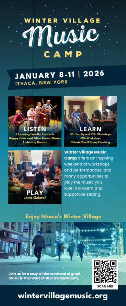 An inspiring weekend of workshops, performances, and many opportunities to play music with others in a variety of styles. Nestled in the beautiful Ithaca NY, it’s a great opportunity to escape to a warm and cozy weekend. Lessons available for Guitar, Mandolin, Fiddle, Banjo, Bass, singing, and more! Learn more at https://www.wintervillagemusic.org/